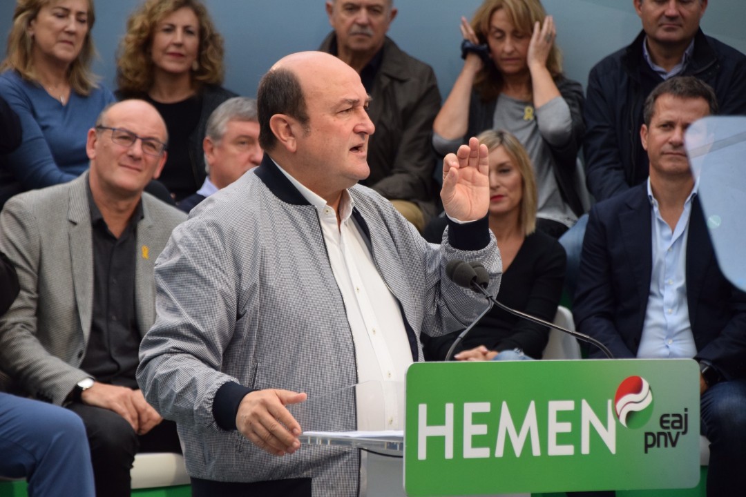 Ortuzar ha lamentado el hecho de que tanto Sánchez como Pablo Casado vinieran a Euskadi el pasado viernes para recabar la confianza de la ciudadanía… “y como vinieron se fueron, raudos y veloces, a otras plazas electorales. Ni una palabra sobre Euskadi. Sánchez apenas estuvo quince minutos en Vitoria. Euskadi, en su agenda, es el tiempo de tomarse un café. ¿Hay mejor símil para identificar lo que a Sánchez le preocupa Euskadi? Quince minutos y agur”, ha asegurado Ortuzar. El líder jeltzale se ha referido al mensaje que dejó Sánchez en Vitoria-Gasteiz. “Dijo que no pactará con el PP, que no habrá ‘gran coalición’. ¿Por qué será que no me fío? Y, por si acaso, le lanzo una pregunta: ¿gran coalición con el PP no, pero investidura con la abstención de Casado… sí?”. Y le ha lanzado una advertencia. “Que no busquen el apoyo del PNV quienes pretenden recuperar el bipartidismo, quienes sueñan con volver a un oligopolio parlamentario en el que a vascos y a catalanes se nos trate como fuerzas residuales. Somos representantes legítimos de una nación, Euskadi, que debe ser reconocida como tal por quien desee nuestro concurso en la estabilidad del Estado”, ha asegurado. En el arranque de su intervención, Ortuzar ha tildado de “curioso” el hecho de que “en España, poner urnas es, según dicen los líderes de los partidos españoles, un síntoma de democracia; sin embargo, reclamar ponerlas en Catalunya o en Euskadi está fuera de la ley. Democracia de embudo: ancha para unos y estrecha para otros”.